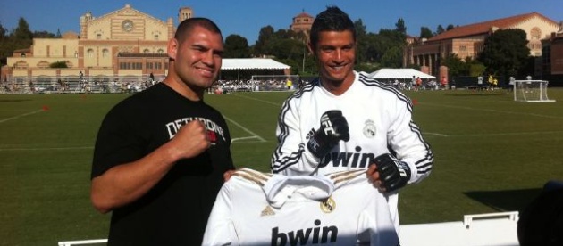 Aproveitando a pré-temporada do time do Real Madrid nos EUA, e sua passagem por Los Angeles, o campeão peso-pesado do UFC Cain Velasquez visitou os “galácticos” no campus da UCLA e tietou o astro Cristiano Ronaldo.